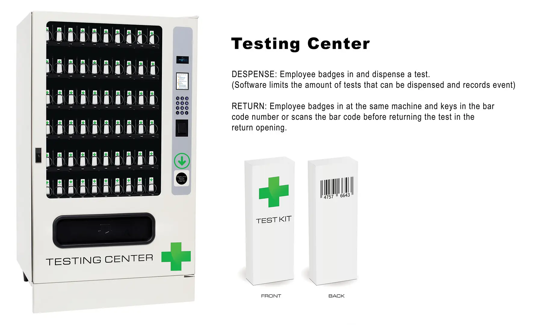 Intelligent Dispensing Solutions’ COVID-19 Test Kit Dispenser & Return Center gives your employees easy access to self-administered COVID-19